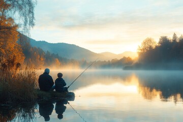 Two generations enjoy a peaceful afternoon fishing by the riverbank during golden hour. Generative AI