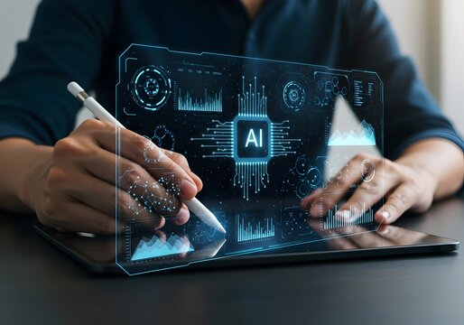 AI image creation technology. Person using digital pen and tablet to AI software to generate images, screen visual, AI Prompt, photo, creativity art picture, Image generated by artificial intelligence