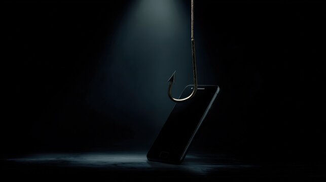 A conceptual image illustrates the dangers of digital phishing, with a smartphone impaled on a fishing hook under a spotlight. ..Created with Generative AI, not depicting real subjects.