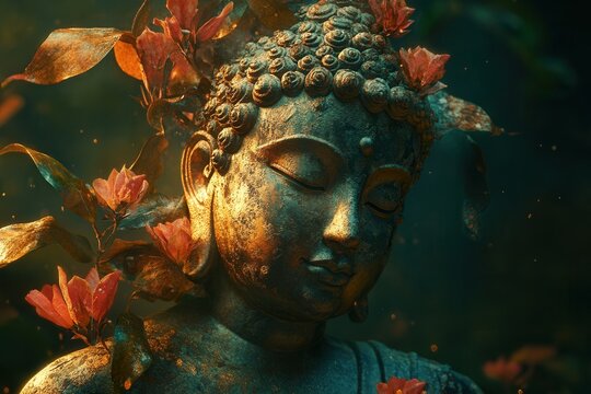 Abstract lifelike Buddha surrounded by flowers and magical lighting in beautiful metallic and stone hues