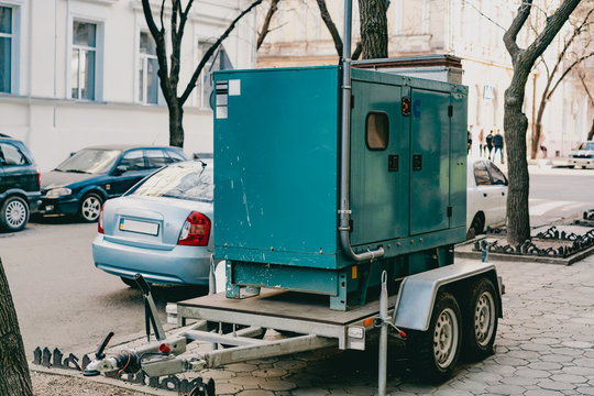 Mobile moveable gensets portable diesel engine power electric generator on a trailer stands on the city's street. Green. Urban. Electricity. Power supplier for business. Outdoor. Sidewalk. Road. Wheel