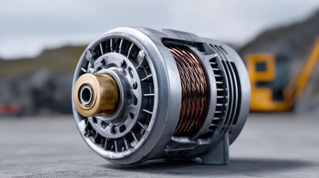A silver and gold engine is sitting on a grey surface. The engine is surrounded by a pile of rocks