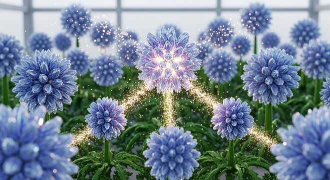 A vibrant garden of radiant blue crystal-like flowers, interconnected by streams of golden light particles, beautifully illustrating a genetic algorithm as a living sculpture.