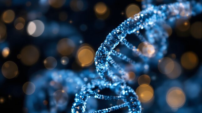 Stunningly intricate blue DNA helix sparkles with golden bokeh, representing life's genetic code.