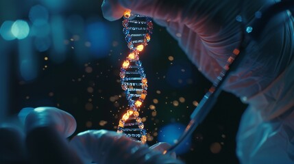 A glowing DNA double helix dominates the foreground, suspended in a blurred, futuristic laboratory setting.  The image suggests scientific advancement and genetic research.