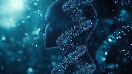 Human head profile with dna strand and blue bokeh lights in a futuristic abstract representation