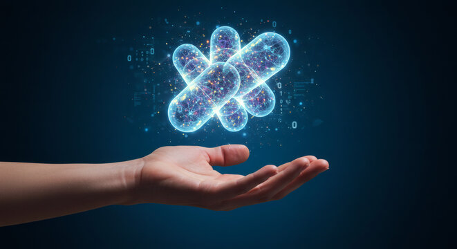 Human hand supporting a futuristic digital representation of bacteria or microscopic organisms, highlighting advancements in microbiology, biotechnology, and health science research