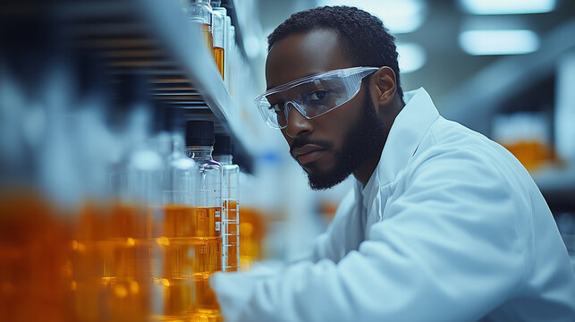 Biochemist studying complex chemical reactions in a sterile laboratory.