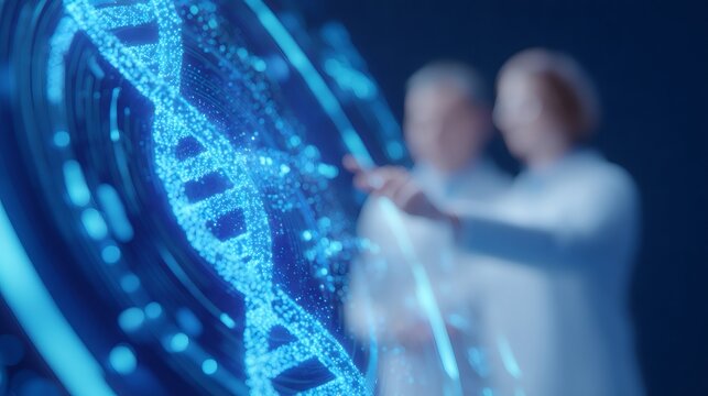 Senior scientist analyzing holographic dna in futuristic genetics lab