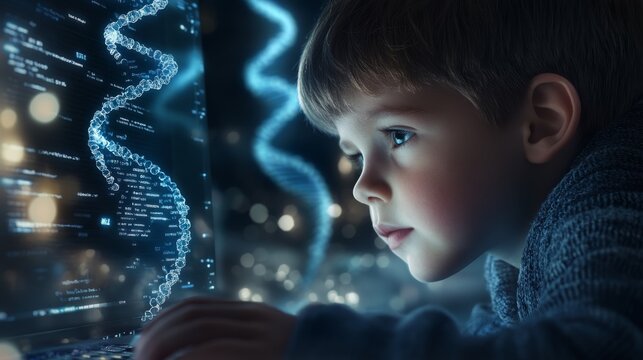 Child posing as a genetics specialist, examining DNA results on a computer, with complex DNA sequences in the background.