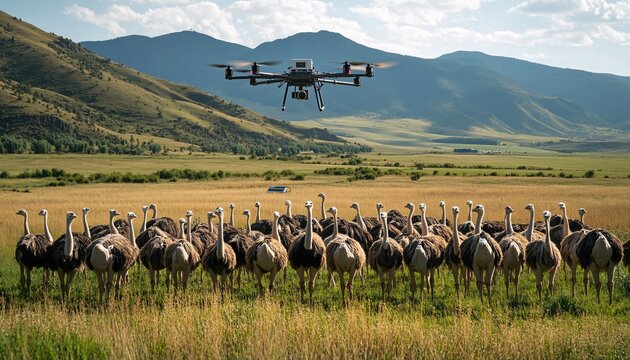 Advanced agricultural technology enhances farming efficiency with drones monitoring an ostrich herd, showcasing innovation in agriculture.