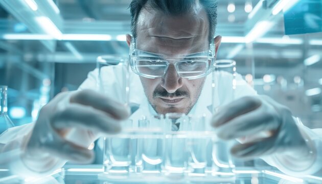 Scientist conducting an experiment in a modern lab, focusing on test tubes. Advanced scientific research in a clean, high-tech environment.