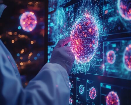 Closeup of a doctor analyzing a 3D holographic scan of cancer cells, highlighting precision medicine and advanced imaging technology, highresolution and detailed