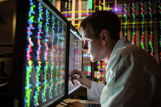 Bioinformatics scientists analyze genomic data on computers, deciphering genetic codes to uncover insights into diseases, evolutionary relationships, and biodiversity.