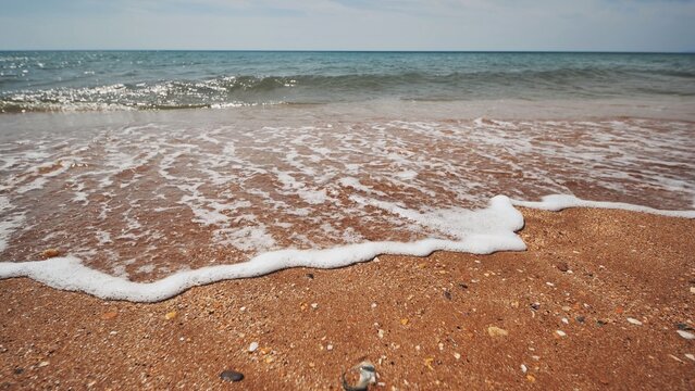 Golden sunset waves lapping sand with lone seashell on tranquil shoreline