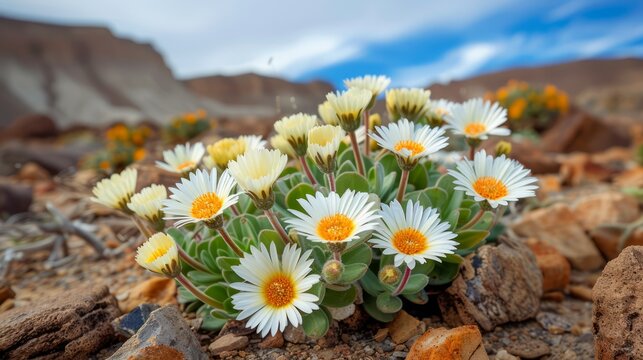 Vibrant Wildflowers Blooming Amidst Rocky Terrain Under Cloudy Sky in Natural Wilderness Setting