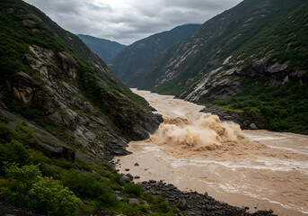 Surfers riding green-blue vortex waves with waves of empathy oceans of change typography