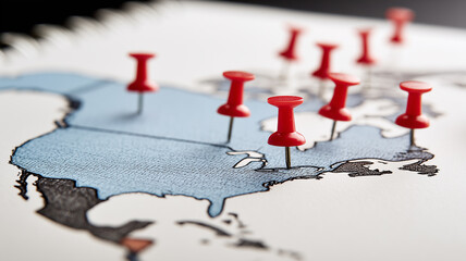 A focused mapping concept showing close up pins marking regions representing geographic targeting precision and strategic identification.