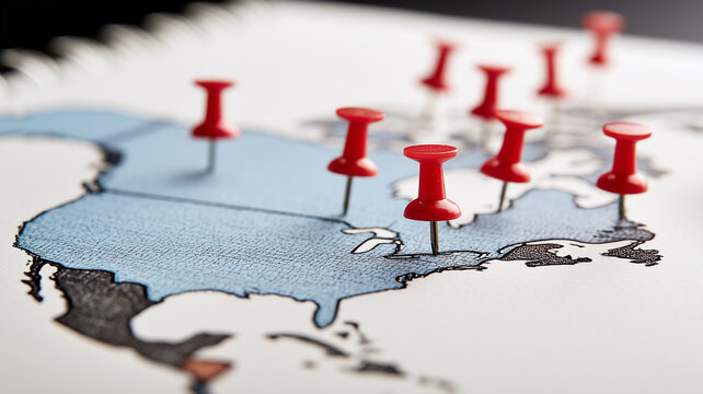 A strategic map with destination pins illustrating geographic planning and the identification of key locations for travel decisions research and organizational analysis.