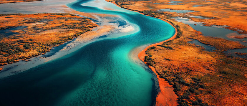Aerial photography of a winding river amidst arid lands - for travel blogs, geographical research, presentations about natural landscapes.