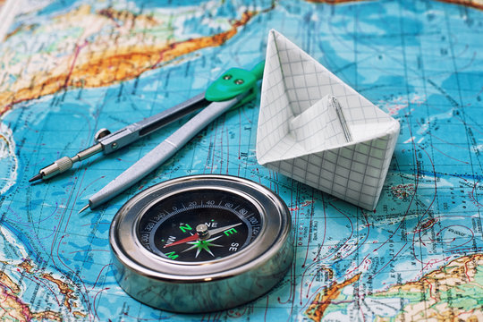 Magnetic compass  and location marking with a pin on routes on world map. Adventure, discovery, navigation, communication, logistics, geography, transport and travel theme concept background..