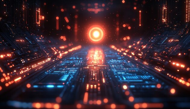 3D rendering of glowing location pin icon on digital city map with blue and orange lighting effects, surrounded by circuit patterns and abstract highway lines connecting urban structures. Concept of A