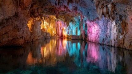 Underground cave with stalactites and stalagmites illuminated with colorful lights reflected in water. Natural wonder and geological formation.
