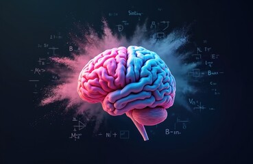Creative mind concept image. Human brain anatomy, science, neurology theme. Pink, blue colors, geometric elements, formulas, handwritten notes evoke smart intellect, memory, imagination, education.