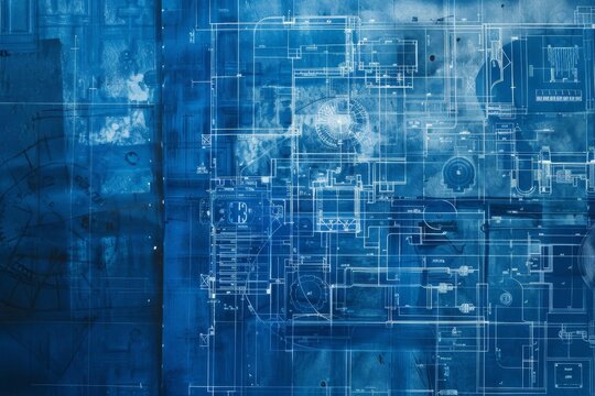 A blue background filled with numerous intertwining lines in a monochromatic blueprint sketch style, Monochromatic blueprint sketch with technical annotations