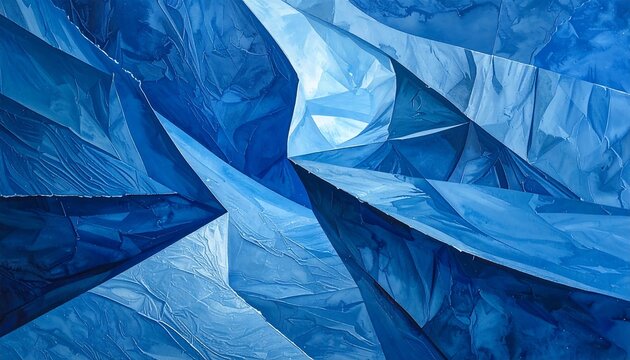 Abstract artwork comprised of layered, folded, and creased blue fabric fragments creating a geometric and dynamic composition