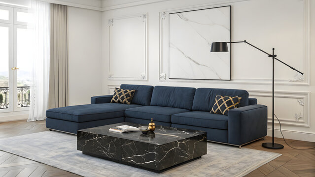 Modern living room with navy blue sectional sofa and marble coffee table