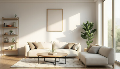 This digital artwork showcases a modern living room with minimalist design. A large neutral-toned sofa, sleek coffee table, and geometric rug create a cozy yet stylish space, illuminated by natural li