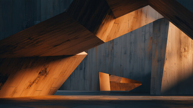 Abstract geometric architectural structure with textured surfaces illuminated by warm sunlight creating dynamic shadows and unique forms in modern design