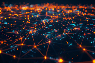 3D rendering of glowing network connections on a dark background, with orange and blue light effects.