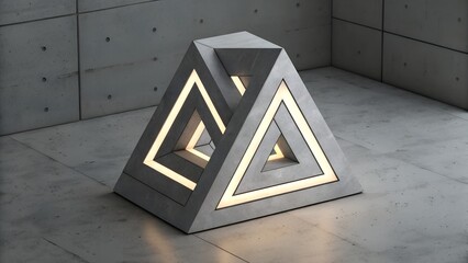 Concrete pyramid sculpture with illuminated triangles in a modern architectural space