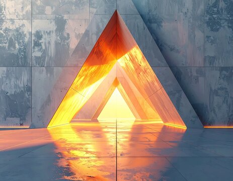 A striking architectural interior showcases a glowing, triangular aperture, bathed in warm orange and yellow light; a modern space featuring concrete walls and floors,