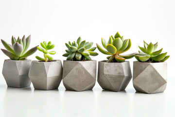 Concrete pot. Close-up green succulent plant in modern geometric concrete planter isolated on white background.