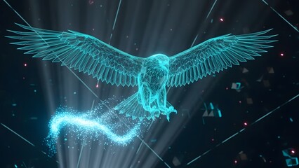 A majestic digital eagle with glowing blue wings and a sparkling tail, soaring through a dark, futuristic environment with light rays.