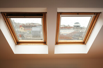 Aerial view pyramid-shaped skylight window flat roof with air conditioners top modern apartment building. Urban development and sustainable lifestyle concept.