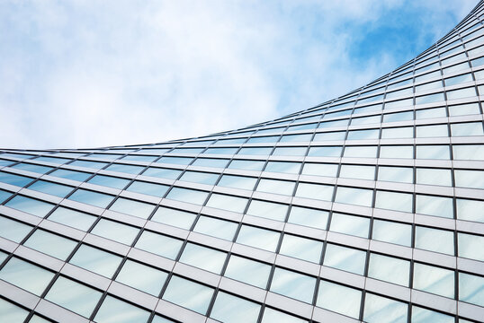 Modern skyscraper with glass facade reflecting blue sky and clouds