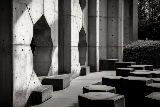 Sunlit concrete structure with hexagonal seating
