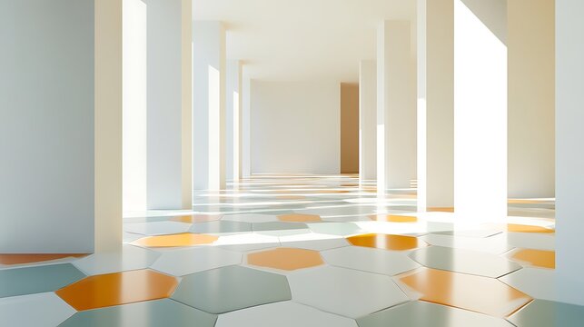 contemporary architectural hallway with minimalist design, geometric hexagonal floor tiles, and bright natural light streaming in, ideal for modern design concepts