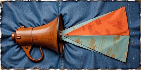 Vintage megaphone with colorful geometric patterns on a denim background.