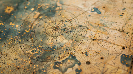 Ancient celestial map with intricate circular patterns. Vintage astronomical chart showing constellations and zodiac symbols. Aged parchment with golden and blue hues, celestial bodies, and cosmic ill