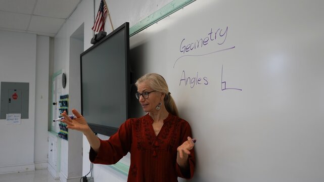 Wide angle view of woman teacher using an interactive whiteboard blackboard in an empty classroom teaching geometry math.