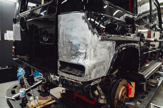 Restoration of vehicles with chain and hook. Repair in the workshop and auto. A broken car with a violation of geometry is on the stocks for leveling.