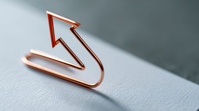 Close-up of a copper arrow-shaped paperclip on textured white paper with soft focus and minimalistic background