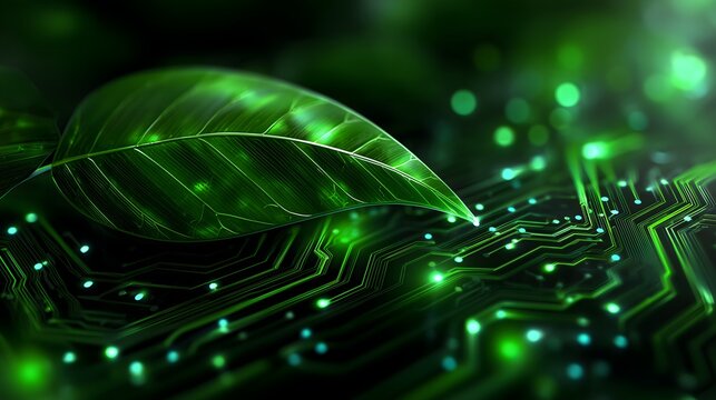 Eco-technology concept background with abstract leaf and green circuit board pattern
