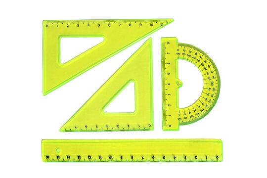 A set of different school rulers lies on a white background.