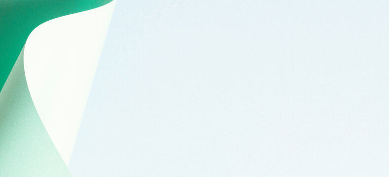 Abstract wave of pastel green paper on light blue background. Creative geometric curved paper with light and shadows. Abstract geometry background with copy space